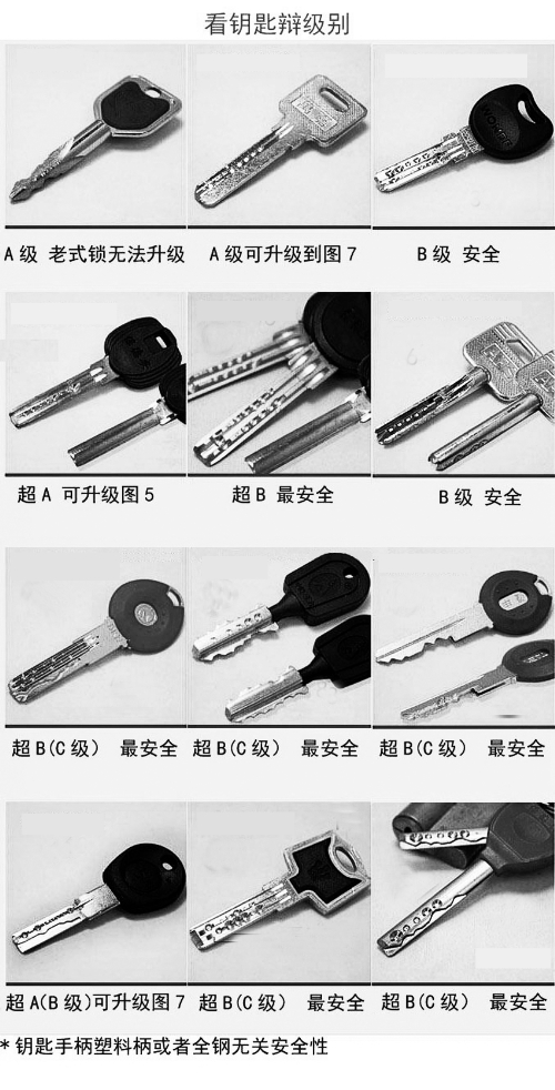 你知道自己家的防盗门锁芯是啥级别吗?采访中,记者随机询问了20多人,绝大多数人都表示不知道,也不知道这事关家中防盗门的安全性。王女士拿出新房的钥匙一看,一排弹珠槽,听说是A级锁芯,她当即表示得抓紧换锁芯。