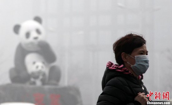 2月28日,当日北京的天空再次被雾霾笼罩,全城多地空气质量达到严重污染级别。图为熊猫雕塑被大雾笼罩。中新社发 韩海丹 摄